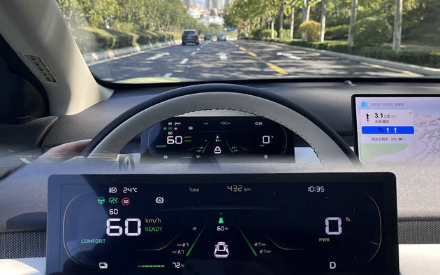 我們此次試駕體驗車型為405km頂配,同時車內乘員3人。120kW的驅動力配合1470kg的整備質量(405km版本),加速表現非常輕快。特別是在城市中穿梭時,嬌小的車身配合充沛的動力,能帶給駕駛者非常不錯的愉悅感。同時與同級多數小型SUV不足100kW的產品相比,長安啟源全新Q05的后段動力儲備也能為用戶帶來很大的信心,不至于在高速路況下露怯。