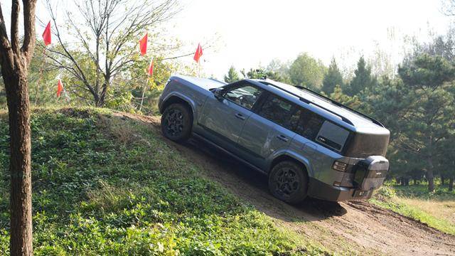 在面對爬坡路段,深藍G318的316kW綜合功率與572Nm扭矩配合ET全地形系統的加持下,通過調節魔毯懸架高度提升通過性,順利完成通過爬坡測試,依托45000N·m/deg的車身剛度,在輕松拿捏越野的同時,又保證了安全性。相比之下,沒有“鎖”的鈦7,要上大角度的坡就需要小心翼翼了。雖然最終也完成了挑戰,但總感覺鈦7硬得還不夠徹底。