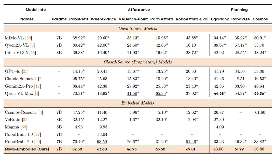 結果表明,MiMo-Embodied 取得了具有競爭力的結果,與通用多模態模型和專用具身模型相比,在可供性預測和空間理解方面表現出特別的優勢。