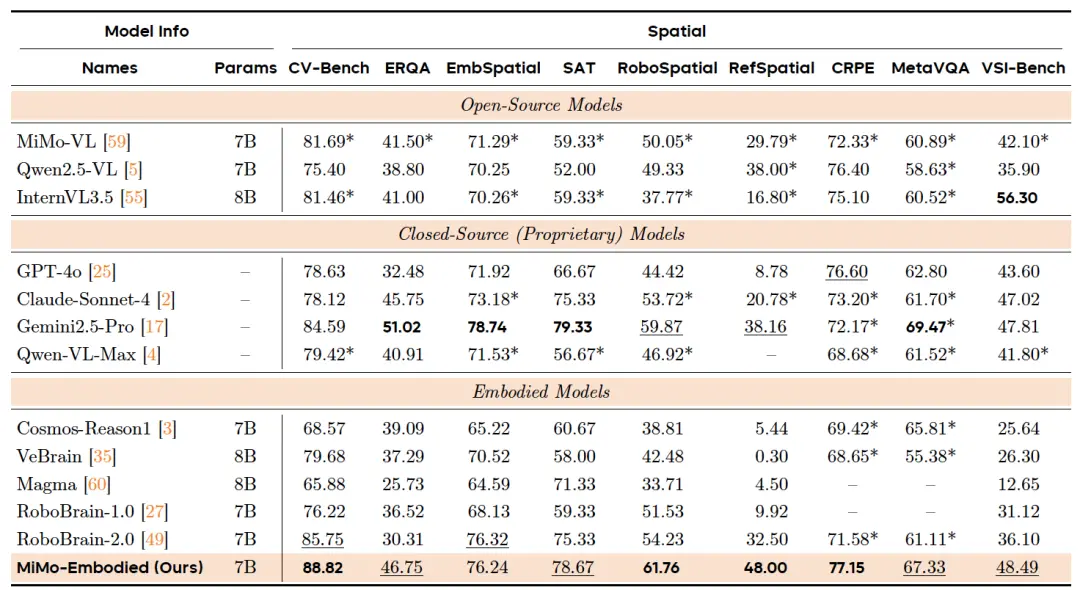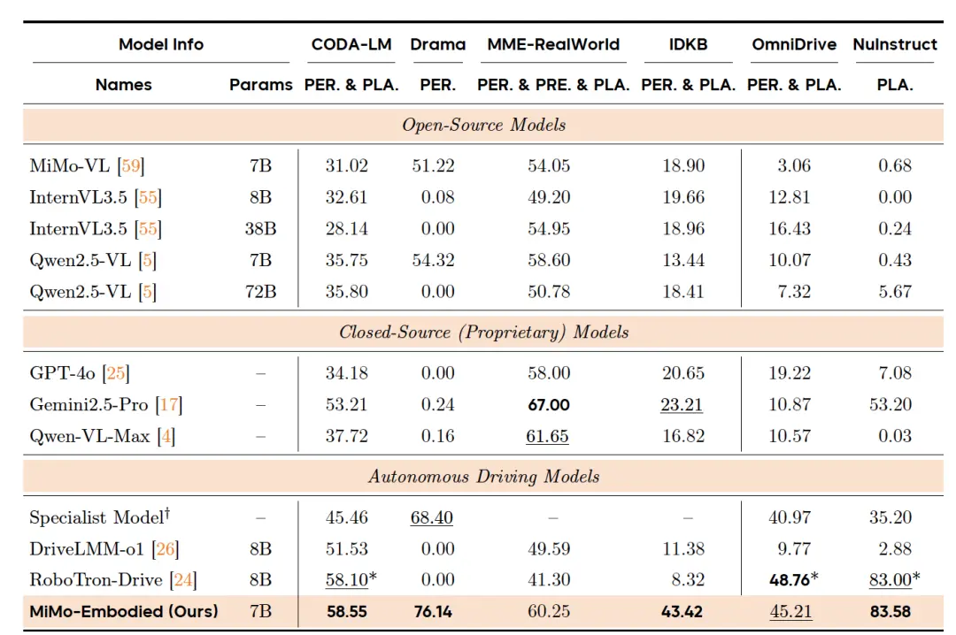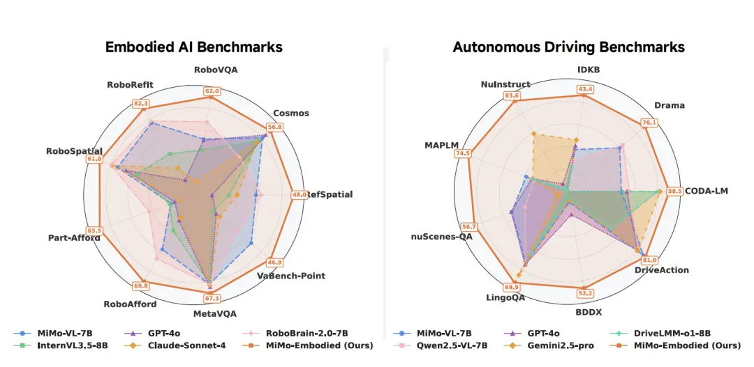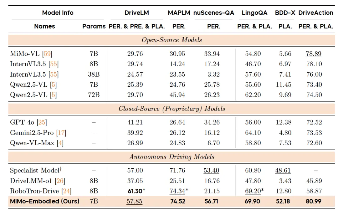 如上所說,小米這次開源的MiMo-Embodied是業界首個開源的、成功融合了自動駕駛與具身智能(Embodied AI)兩大領域的統一多模態基礎模型。