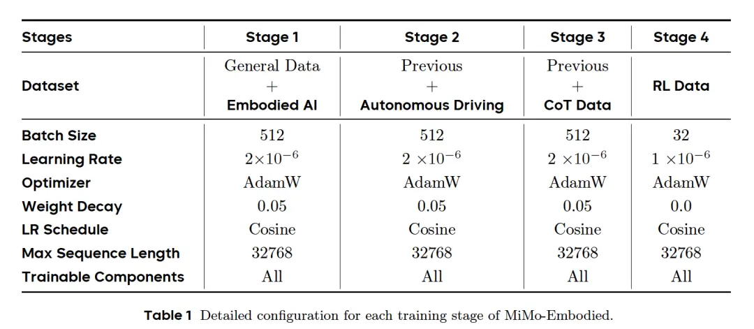 它基于MiMo-VL架構,通過構建涵蓋通用視覺、具身任務及駕駛場景的高質量數據集,并采用包含思維鏈(CoT)和強化學習(RL)的漸進式四階段訓練策略,有效打破了室內操作與戶外駕駛之間的領域鴻溝。