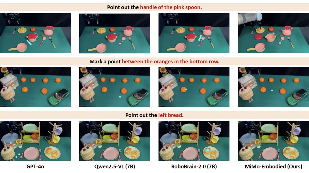 在操作任務中,MiMo-Embodied同樣展現出強大的可供性和空間推理能力。