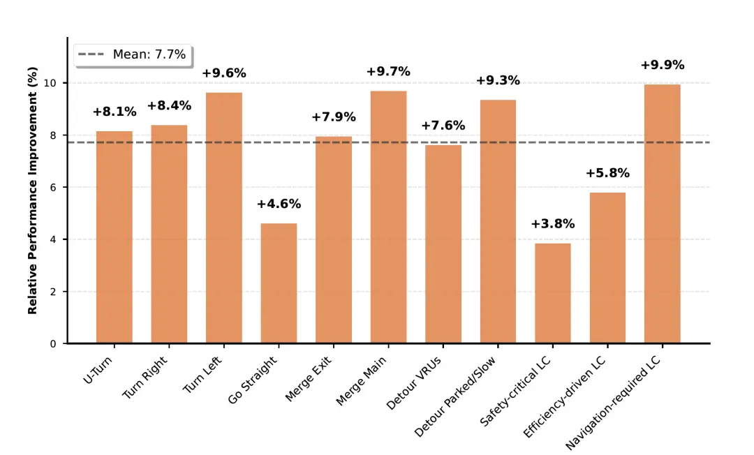 最終,該模型在任務規劃、空間理解、環境感知及駕駛規劃等29個基準測試中,均超越了現有的專用模型及通用模型,實現了跨領域的最先進(SOTA)性能。