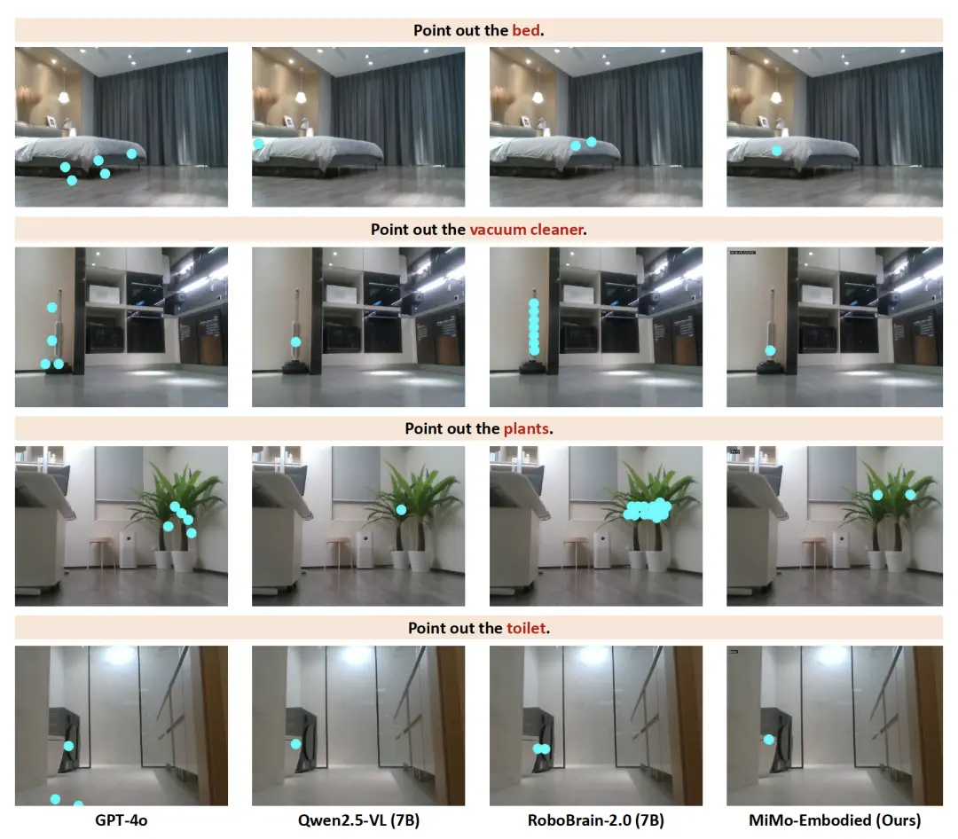 在具身導航中,相較于GPT-4o、Qwen2.5-VL和RoboBrain-2.0,MiMo-Embodied展現出在多樣化家庭場景中增強的對象定位能力和一致的性能。