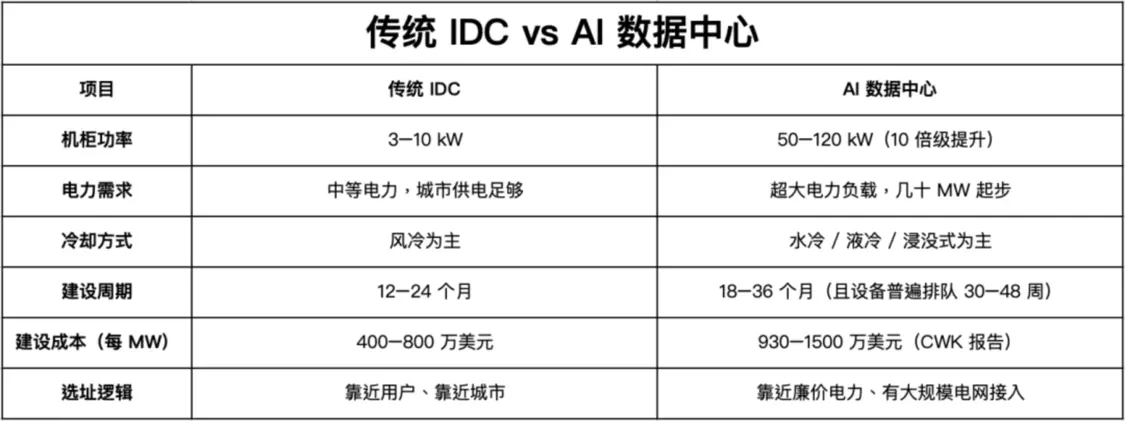 而AI數據中心最大痛點是電力指標、電網接入和冷卻系統的極限性能。完全不是一個物種,IDC機房基本被歸到輕工業、IT服務,到了AI數據重心屬于妥妥的重工業。