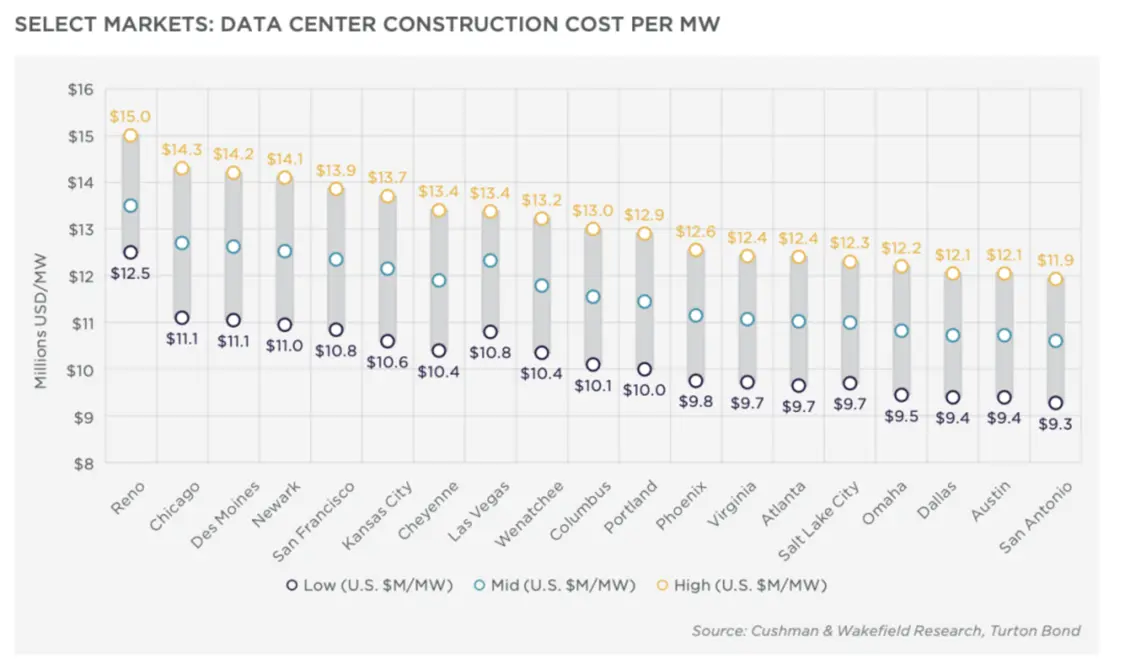 平均每MW的建設成本漲到930–1500萬美元,開發商被迫向二三線地區遷移。現在玩的是誰能拿到電,誰才能談算力,誰能把場站交付出來,誰才能談AI。