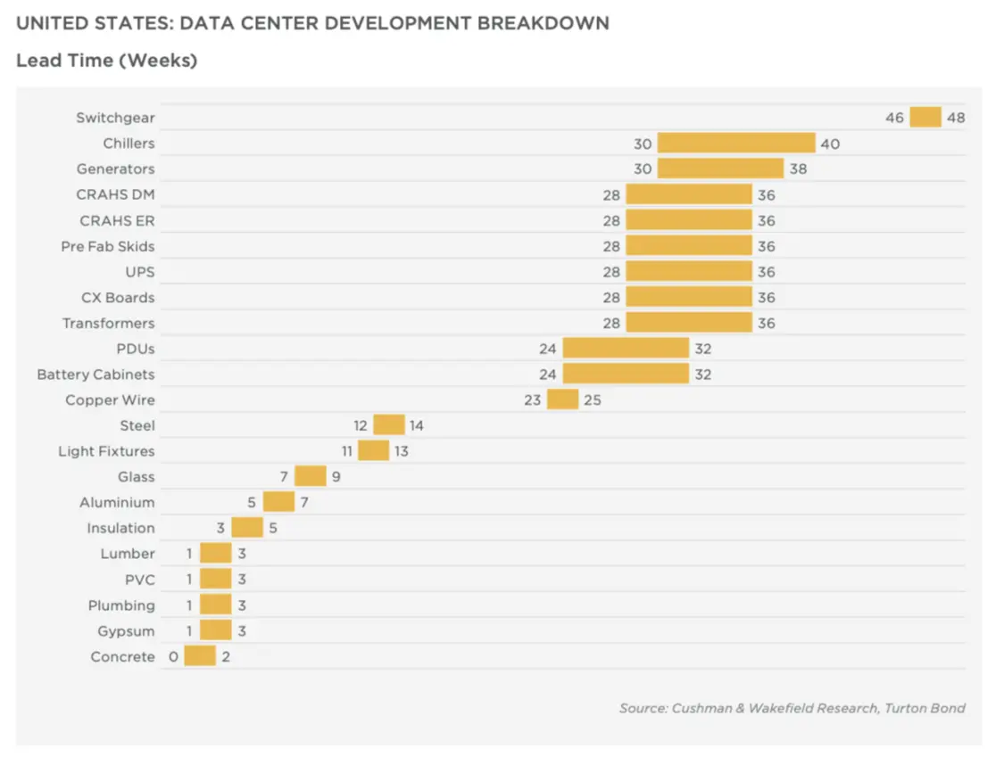 所以行業現在普遍共識不是缺GPU,而是缺能讓GPU通電的地方。Cushman & Wakefield的2025報告提到,北美成熟市場已經全面進入電力短缺,變壓器、UPS、switchgear的交付周期普遍拉到30–48周。
