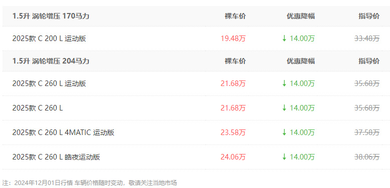 車叔近日從北京某經銷商處了解到,2025款奔馳C級最高優惠14萬元,但部分車型有較多的優惠條件,包括需要加裝裝飾、店內上牌、店內上保險等。