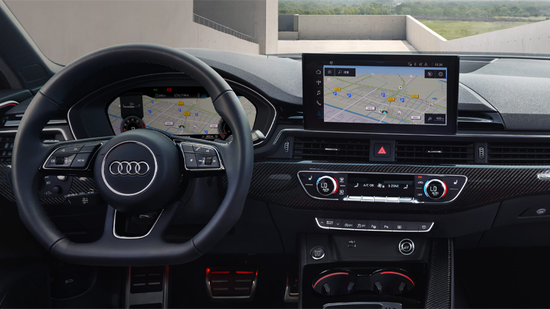 內飾方面,新款奧迪A4L保持了奧迪一貫的運動風格,通過豪華真皮風格包裹(對比色縫線)和平底三輻運動型多功能真皮方向盤進一步增強了內飾的運動感。此外,還提供了19揚聲器的Bang&Olufsen音響系統作為選配。在智能配置上,新車提供了360°全景影像系統、智能泊車系統、主動車道保持系統、自適應巡航控制系統、側向輔助系統和動態轉向系統等選裝配置。