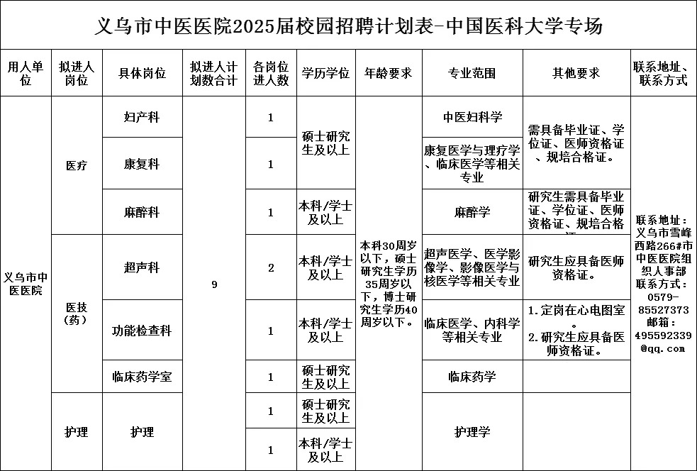 (五)本次校園招聘具體崗位、報考條件及相關要求見以下《義烏市中醫醫院2025屆校園招聘計劃表》。