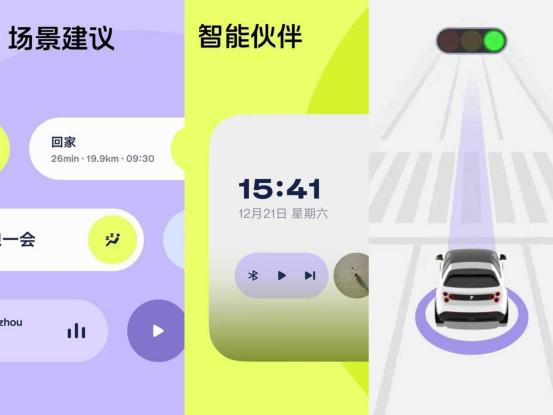 最后是智能化層面,這方面主要是車機表現,首先在界面上采用扁平化設計,配色也比較有活力,在功能上螢火蟲提及了場景建議、智能伙伴以及支持紅綠燈讀秒的車機地圖。