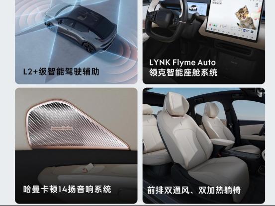 其次是配置水平,領克Z20很好繼承了吉利系新車的配置特點,那就是豐富的標配水平,全系標配了7個安全氣囊、L2+級駕駛輔助、多項主動安全功能、前排座椅的電動調節、前排座椅通風加熱記憶、256 色無線浪潮氛圍燈、50w手機無線充電、14揚聲器哈曼卡頓音響等,該有的舒適性配置基本配齊,很難想象這一個帶有“小資”標簽的個性化車型,有點太實用了。