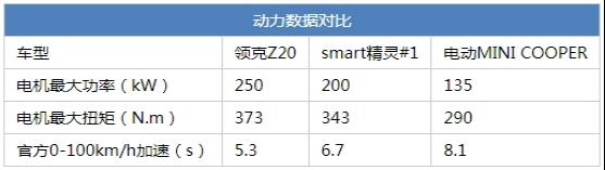 首先是動力,同為單電機后驅的車型,領克Z20的單電機最大功率250kW,最大扭矩373N.m,零百加速5.3秒,這個成績,與同樣定位純電精品小車的smart精靈#1和電動MINI COOPER相比可謂優勢很大,妥妥的小鋼炮。