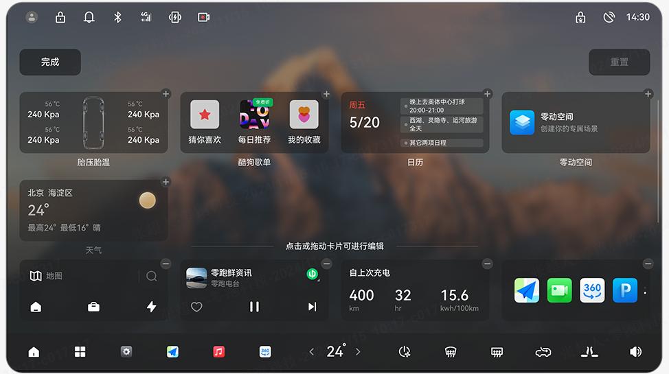 上車時,我們可以通過車機屏幕上的卡片信息來確認行車狀態,Widget卡片在現有卡片基礎上新增了胎壓、天氣、日歷、靈動空間、酷狗,可以方便一眼看到,同時中控界面還新增了輪胎溫度顯示,車輛信息更加全面了。