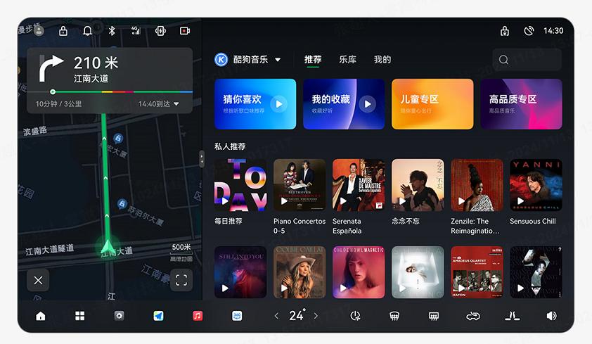 行駛的途中總要有點音樂解悶,但是之前如果開著導航想操作音樂就得切換界面,不僅麻煩,分神了還有安全隱患,這次OTA后分屏顯示終于來了,現在地圖在導航狀態下支持零聽、愛奇藝、網易云音樂、芒果TV、優酷視頻、天氣、電話APP分屏顯示,可通過“設置-顯示-導航應用時應用分屏”來開啟,這樣導航聽歌就可以兩不誤了。