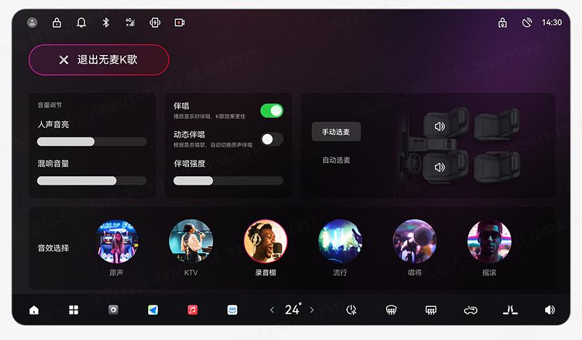 功能開啟后整個車就可以變成移動K歌廳了,你既可以打開全民K歌的MV跟唱,還可以在其他音樂軟件播放歌曲時一鍵打開伴唱功能,系統將自動去掉原唱聲音,方便你一展歌喉。