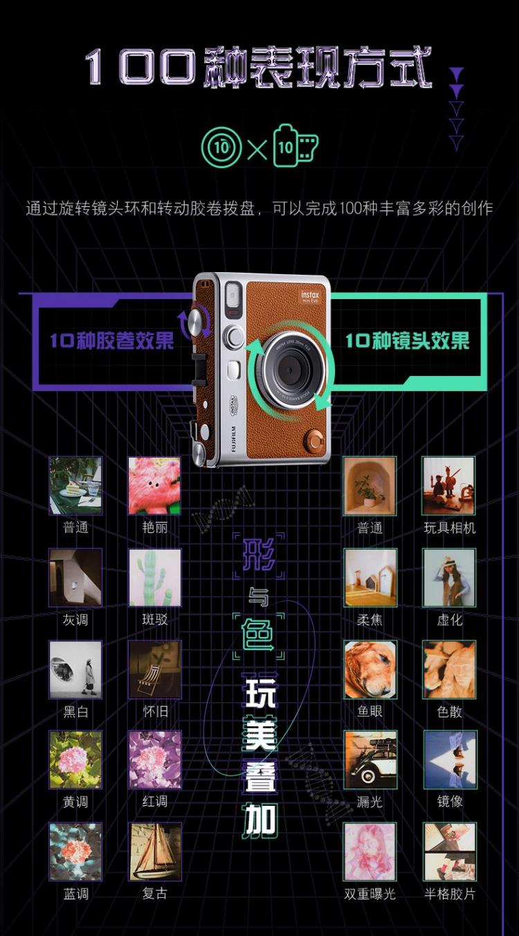 外觀上,WIDE Evo和mini Evo都采用了復古旁軸相機的外形,加上機械撥桿打印的方式,直接把情懷拉滿。功能上,它可以拍攝出豐富的畫面效果,其中mini Evo支持10種鏡頭效果,以及10種膠卷效果,彼此組合,可以實現100種濾鏡組合。