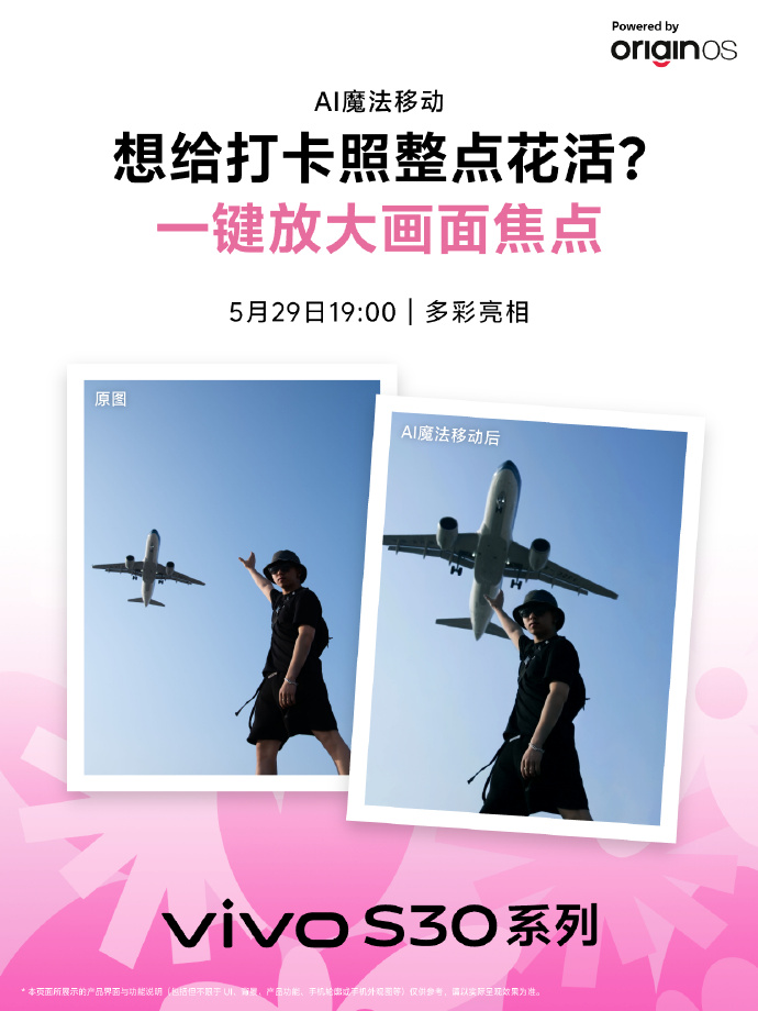 先來看吸睛的新功能——AI魔法移動。這是vivo為日常用戶帶來的一項“拍完還能改”的黑科技。不再需要借助第三方修圖工具,S30系列支持用戶通過AI輕松調整照片中的焦點位置,比如合影時拉近與朋友的距離、補足失焦的精彩瞬間、放大某一個特別的細節。這種“拖拽即所見”的操作。