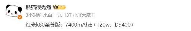 數碼博主 @熊貓很禿然爆料稱,REDMI K80 至尊版手機配置將搭載了天璣 9400 + 處理器,配備 7400mAh 大容量電池,并且支持 120W 快充技術。