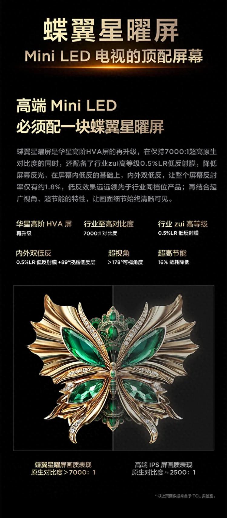 我們先來看看屏幕。TCL T6L Pro用的可是去年最高端旗艦機型才用得上的高端低反屏——蝶翼星曜屏。這屏幕有啥好處呢?簡單來說,就是它的對比度能達到7000:1,還有0.5%LR低反射膜,整機反射率才1.8% 。像咱平時白天看電視,就算不拉窗簾,屏幕也不會反光得厲害,畫面依舊清晰。晚上開燈看,也不會有煩人的倒影。前段時間我朋友家剛買了這臺電視,周末喊我們去他家看球賽,大中午的陽光照進客廳,電視畫面一點沒受影響,球員在綠茵場上奔跑的畫面清晰得很,細節滿滿。海信小墨E5Q呢,不同尺寸屏幕不太一樣,100/55吋是柔光防眩屏(磨砂屏 ),85/75/65吋是墨晶屏(AGLR屏 ),反射率在2.6%左右,防眩光效果也有,但對比之下,TCL T6L Pro在抗反光這塊確實更勝一籌。