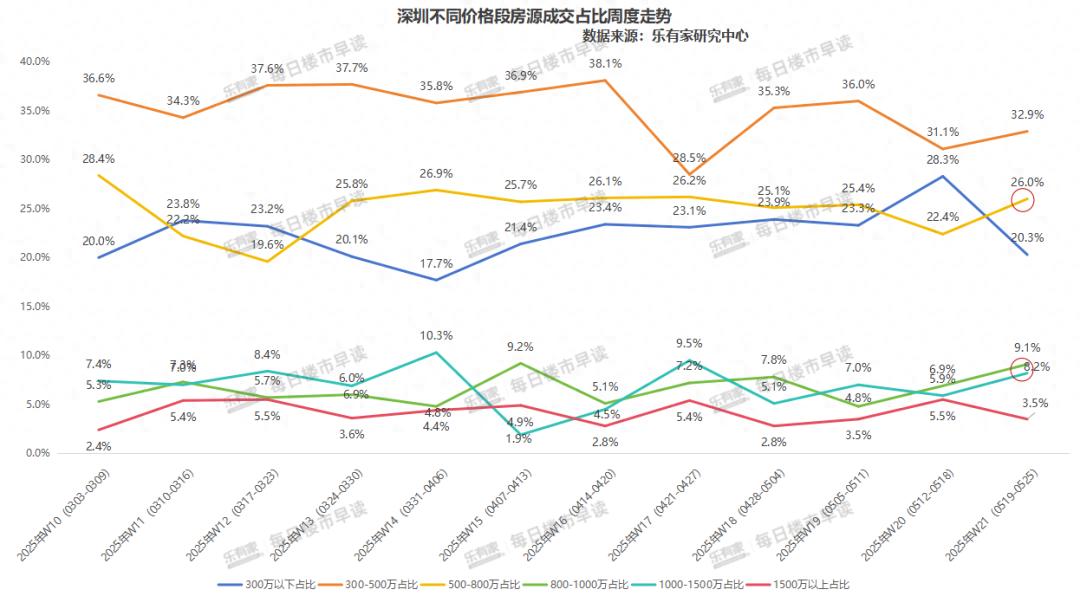 樂有家研究中心數據顯示,上周深圳500-800萬剛改及800-1500萬改善客群成交占比有所提升,分別提升3.6、4.5個百分點,尤其是800-1500萬改善需求,漲至相對高點,需求置換輪動。(樂有家研究中心)