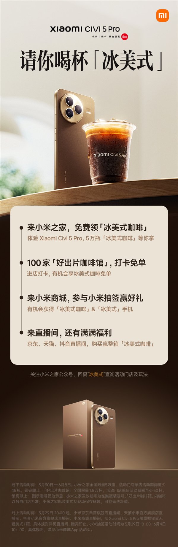 據介紹,粉絲們來小米之家體驗小米Civi 5 Pro,就能免費領冰美式咖啡,限量5萬瓶。