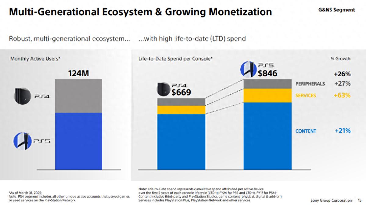 據報道,在索尼的年度投資者大會中,索尼互動娛樂(SIE)總裁兼首席執行官西野英明(Hideaki Nishino)演講時的PPT展示了截至2025年3月31日PlayStation平臺每月活躍玩家數量約為1.24億人,從其中的條形圖可以看出PS5的占比高于PS4。此外值得一提的是,此前索尼曾在2024年CES大會上表示PlayStation平臺每月活躍玩家數量約為1.23億人,而本次大會上宣布的1.24億月活躍用戶不僅代表PlayStation玩家數量實現增長,更是PlayStation平臺月活躍玩家數量的歷史新高值。