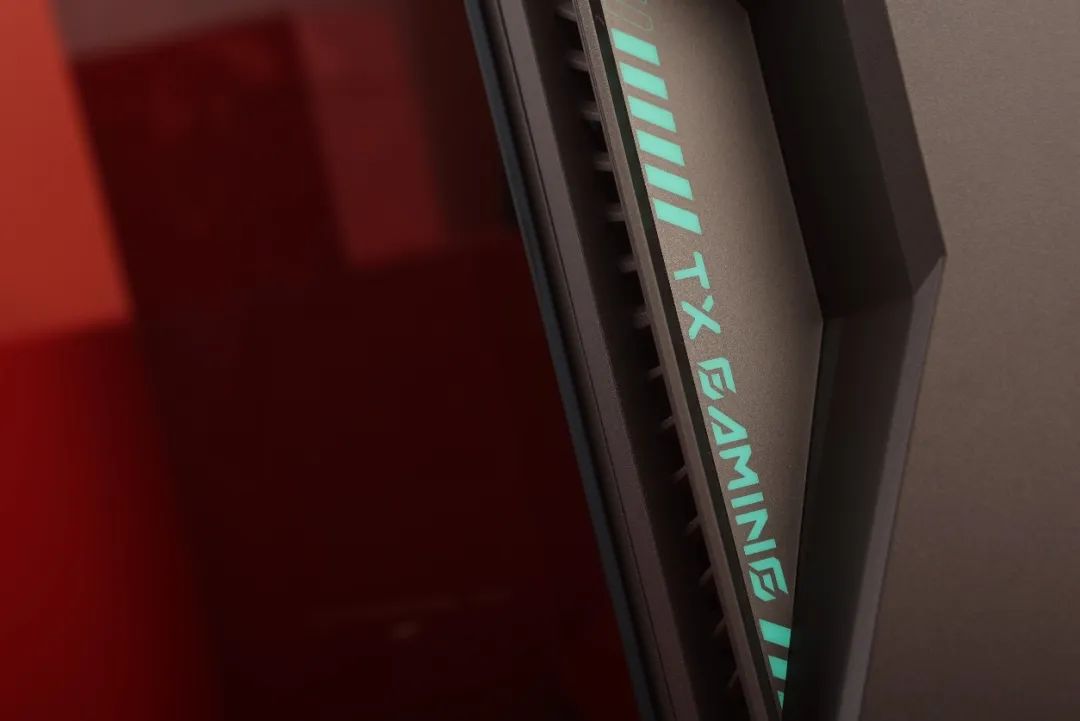 ▲左側(cè)進(jìn)風(fēng)口外側(cè)印刻了科幻風(fēng)的青藍(lán)色TX GAMING字樣