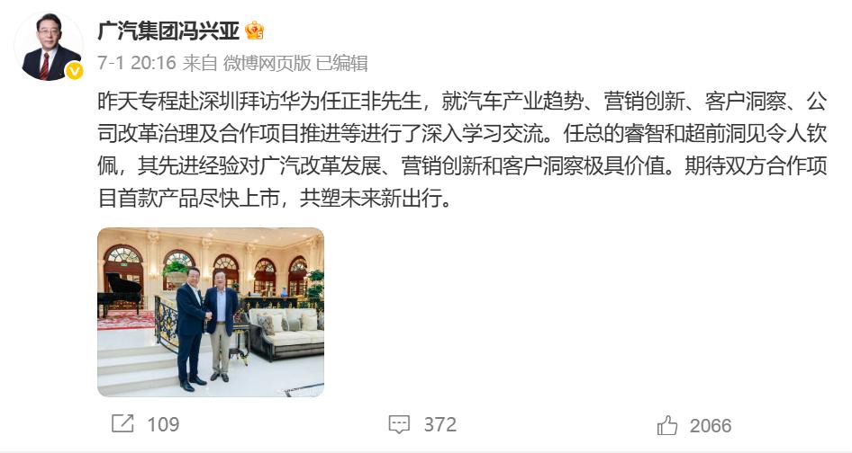 7月1日,華為創(chuàng)始人任正非與廣汽集團(tuán)董事長馮興亞在深圳進(jìn)行了一場會談。