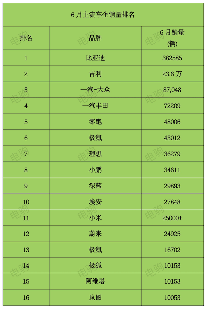 6月主流車企銷量:比亞迪一哥,零跑新勢力一哥,小米或未來一哥!