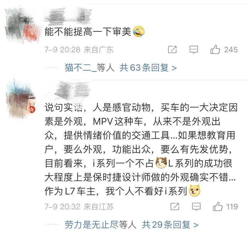 在李想公布i8發布日期的微博評論區,最高贊評論直言:“能不能提高下審美?”次高贊評論(除李想本人轉發評論外)則表達了作為L7車主對外觀和功能性的擔憂:“我個人不看好i系列。”