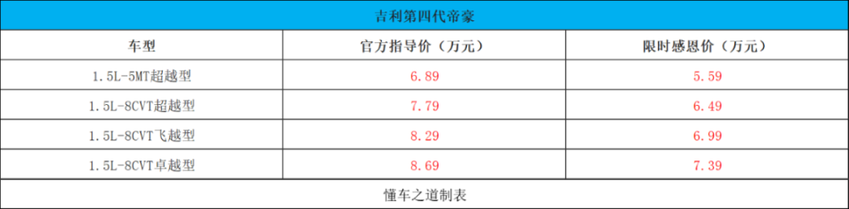 7月9日,吉利汽車官方宣布,第4代帝豪全球400萬(wàn)紀(jì)念款車型上市,新車共推出1.5L-5MT和1.5L-8CVT兩種動(dòng)力組合共4款車型,官方指導(dǎo)價(jià)6.89-8.69萬(wàn)元,限時(shí)感恩價(jià)5.59-7.39萬(wàn)元。新車的整體外觀設(shè)計(jì)沿用了現(xiàn)款帝豪的整體設(shè)計(jì)樣式,加配了LED前大燈、540°透明底盤、6安全氣囊、電動(dòng)座椅等豪華配置。