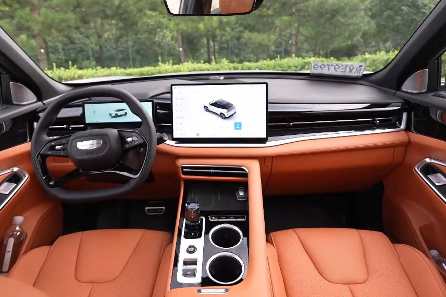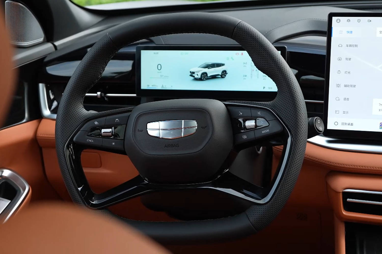 車內變化主要體現在中控區,新車使用了14.6英寸橫向屏幕,對應的周圍裝飾也進行了適應性調整,例如增加鍍鉻裝飾進行襯托。配置上,中控屏分辨率為1920×1080,使用吉利最新版Flyme Auto 1.8系統,支持小窗同屏多任務模式、手勢控制、全語音控制、高德地圖810版以及AI智能交互等,同時全系標配手機APP遠程控制,屏幕下方還配有50W無線充電面板。