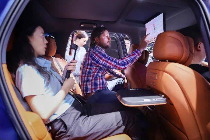 M8在此基礎上堆疊了更多“面子工程”。例如32英寸激光投影巨幕,68英寸AR-HUD,矩陣式可編程尾燈,以及更高級的多區空調與氛圍燈系統。這些功能極具豪華感,但屬于錦上添花而非剛需。